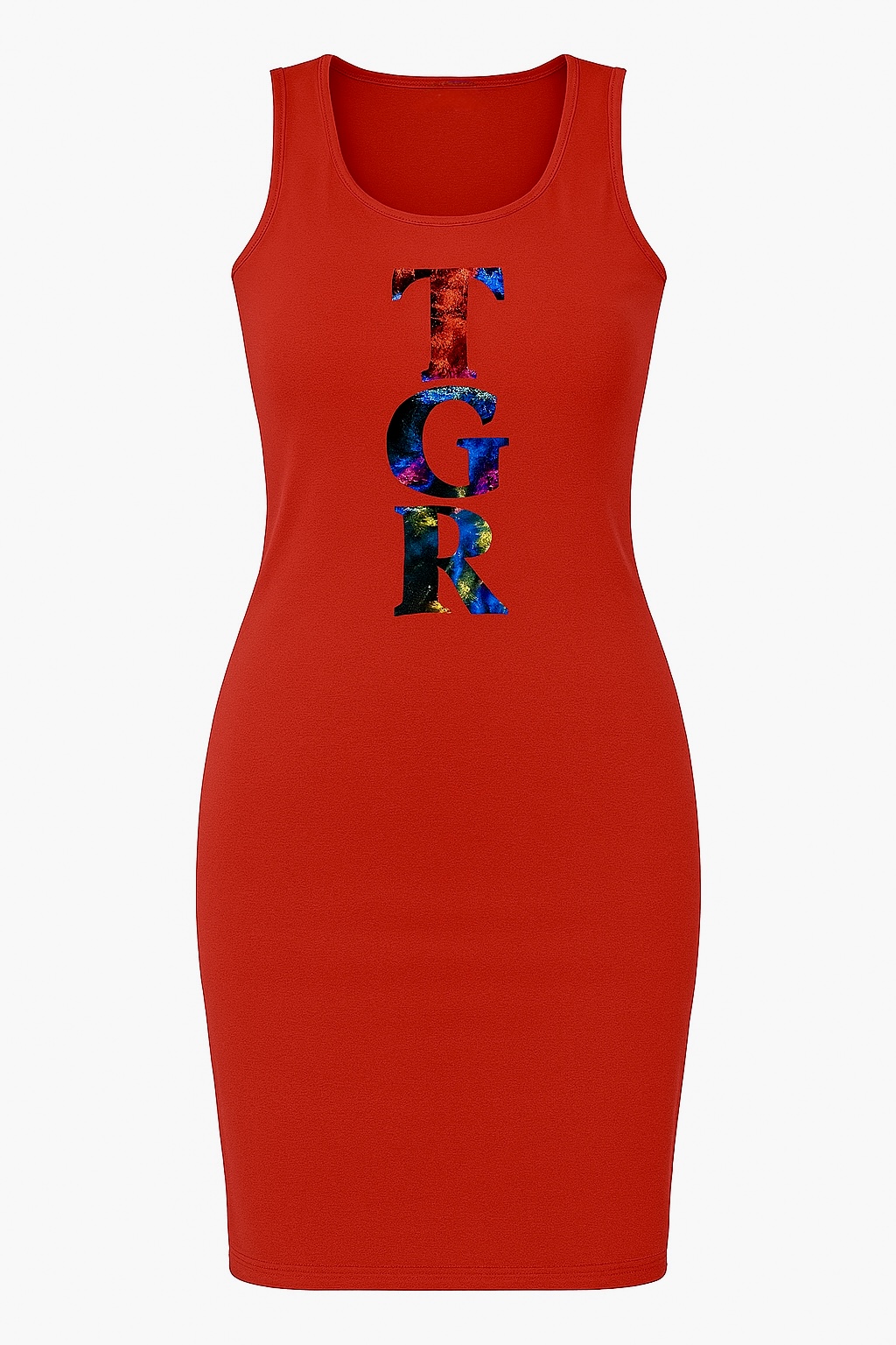 Vibrant red tank top with vertically aligned holographic TGR letters. Bold, comfy, and empowering.