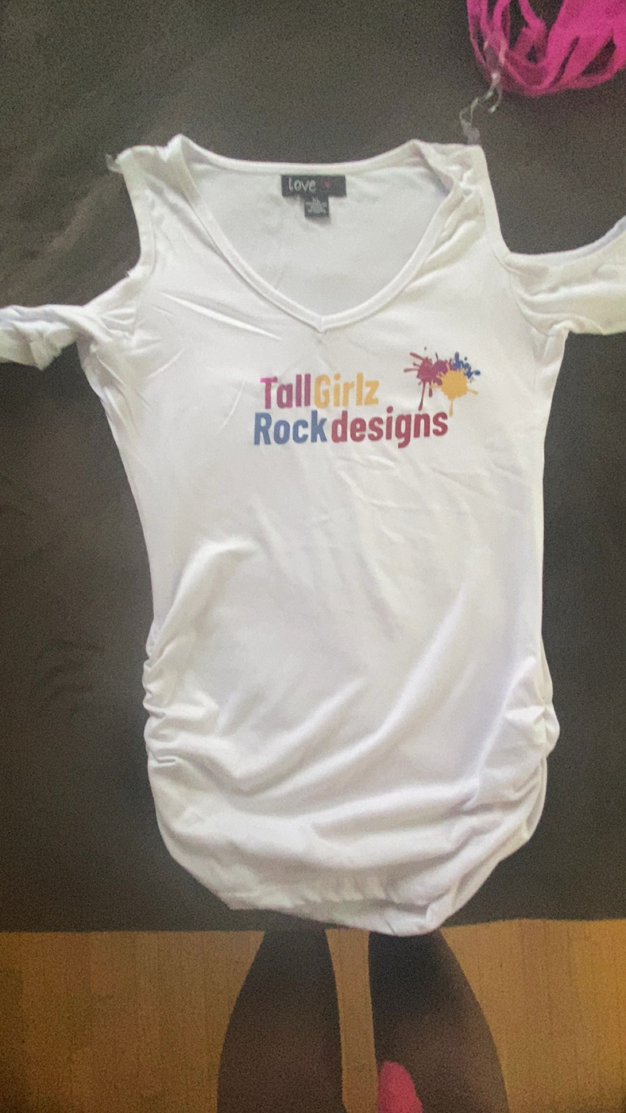 Trendy white tee with cold shoulders and colorful ‘Tall Girlz Rock designs’ logo. Ideal for standout everyday wear.